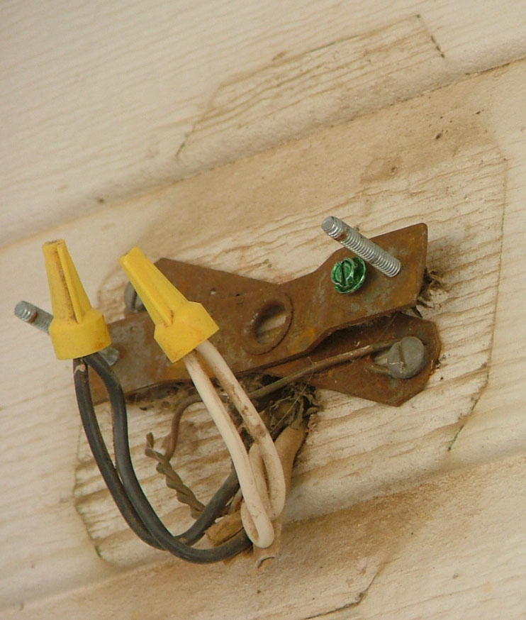 I unscrewed the nuts and pulled the old light off. Once I quit being skeeved out by all the cocoons/webs/bug remains, I found this fine example of home improvement. The mounting bracket was screwed into the siding instead of an electrical box. I guess they must have just sided over the box at some point. I was somewhat flummoxed about what to do next. Eventually, I figured out how to make the mounting hardware that came with the new lights work.